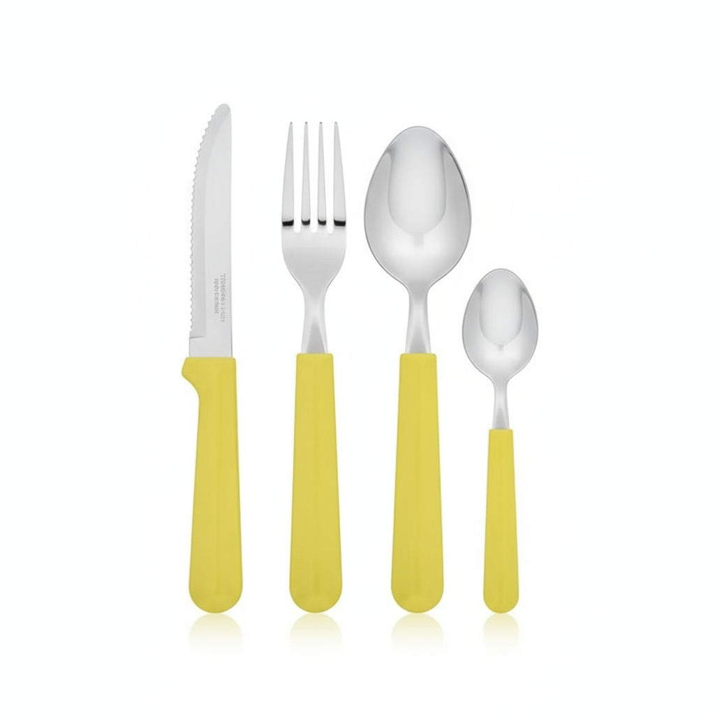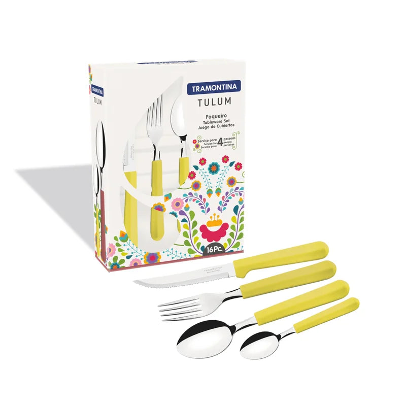 Traga mais estilo, alegria e praticidade à sua mesa com o faqueiro Tramontina Tulum 16 Peças (cód. 23299/280). Produzido em aço inox resistente e com cabos em polipropileno colorido, este jogo de talheres une design funcional e cores modernas para o uso diário.