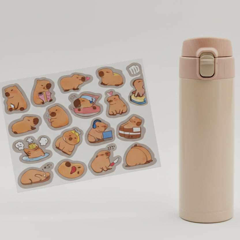 Garrafa Térmica Inox 420 ml Capivara – Aço Inoxidável, Adesivos Divertidos, Tampa com Trava, Portátil e Reutilizável