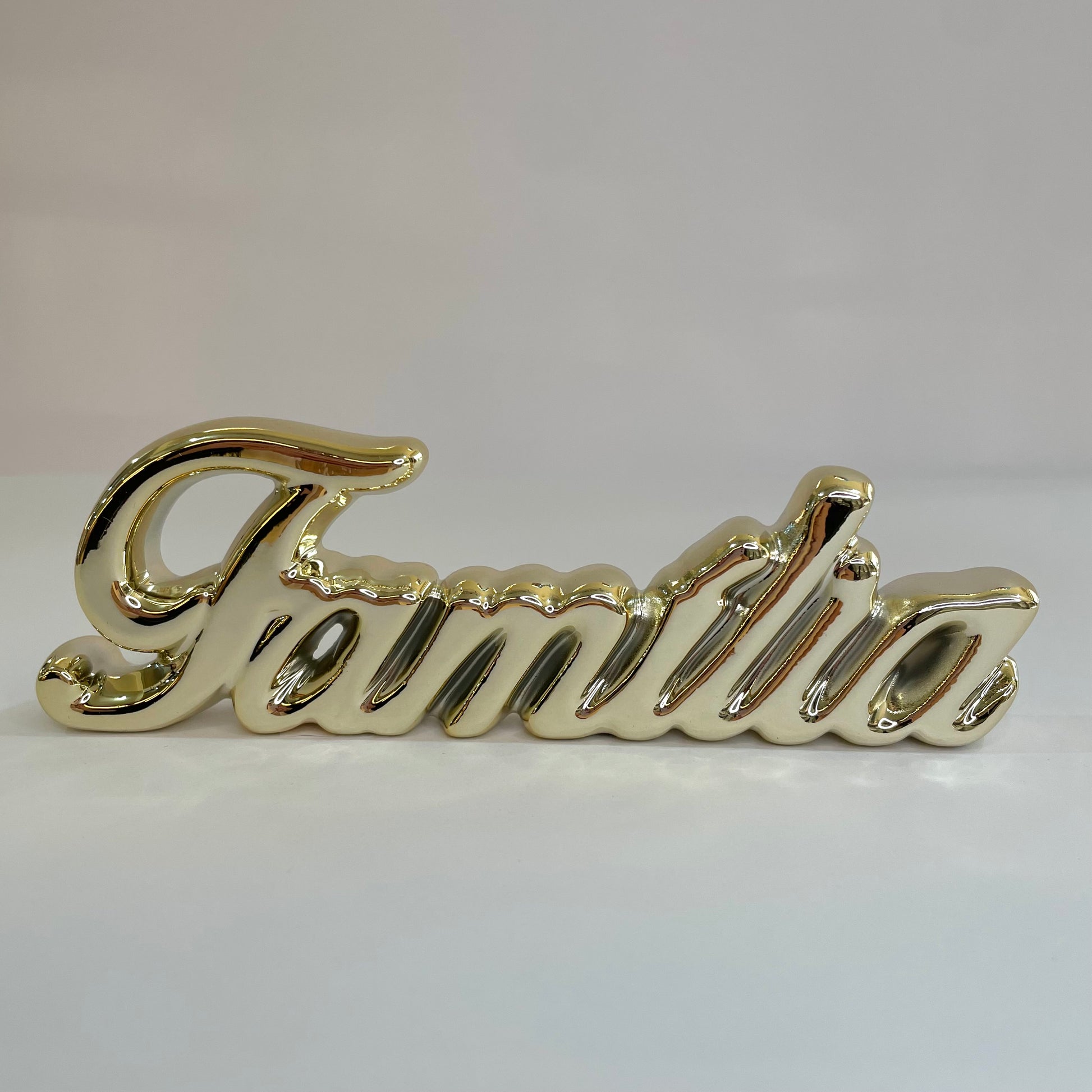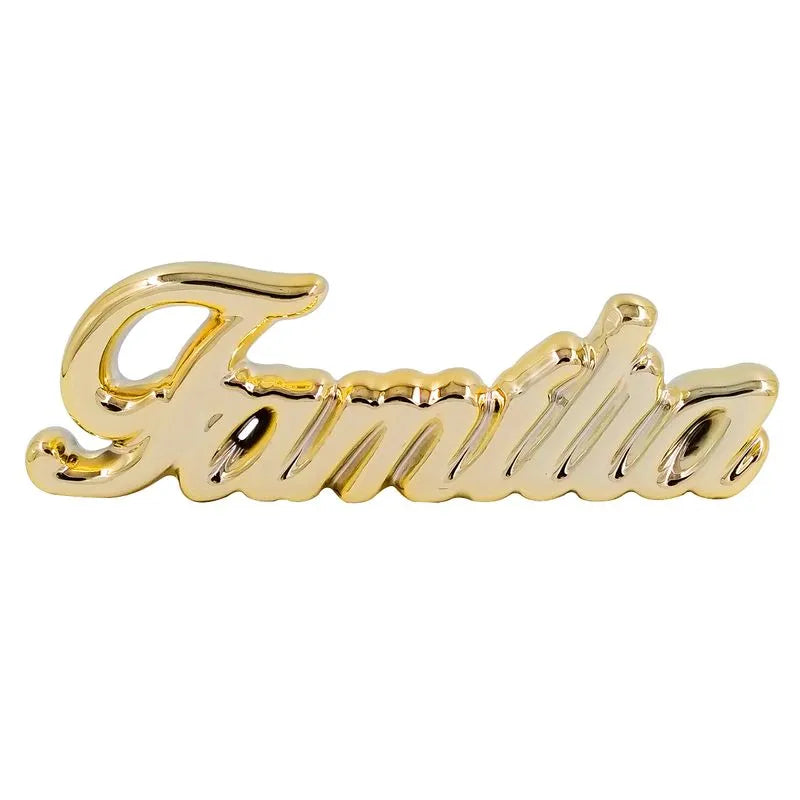 Design minimalista e elegante: a palavra “Família” em cerâmica com acabamento metálico destaca-se com sutileza na decoração.